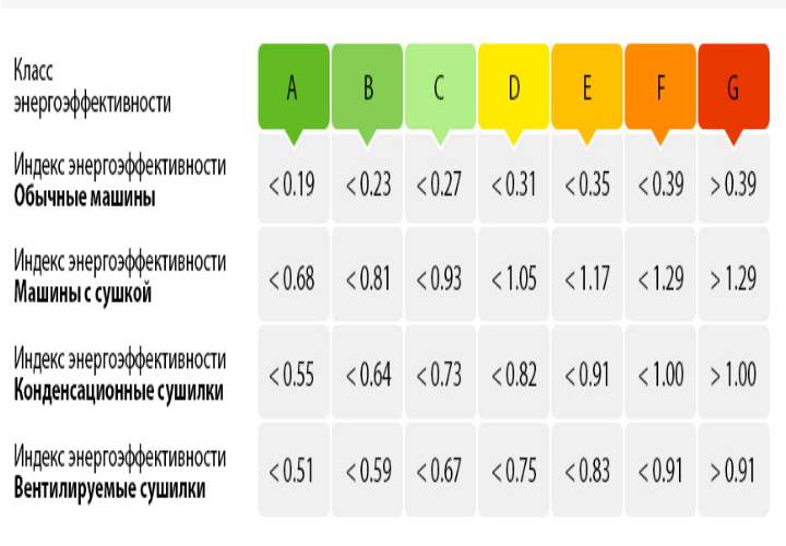 Машините с клас "А" са маркирани в яркозелено. Пералня с клас "A+++" изисква по-малко от 0,13 kWh, пералня с клас "A++" изисква 0,15 kWh на 1 кг пране, пералня с клас "A+" изисква 0,17 kWh, а пералня с клас "A" изисква между 0,17 и 0,19 kWh. Пералнята с клас "B" може да се разпознае по бледозеления си цвят на скалата. Класовете C и D са нюанси на жълтото, а E, F и G са маркирани в червено.