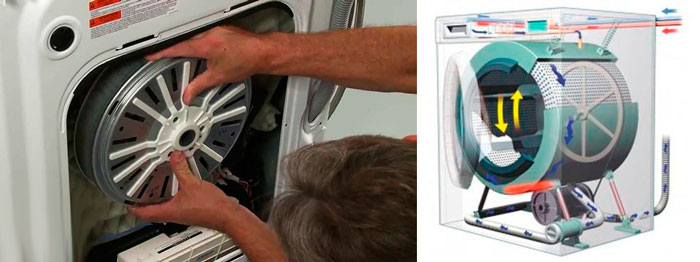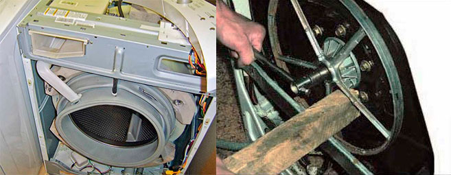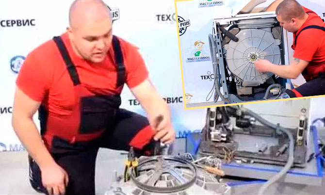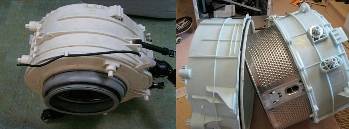 This service is the most expensive because the machine must be completely disassembled. The bearing and seal are located at the rear of the drum. To determine whether the bearing is faulty or not, rotate the drum by hand.