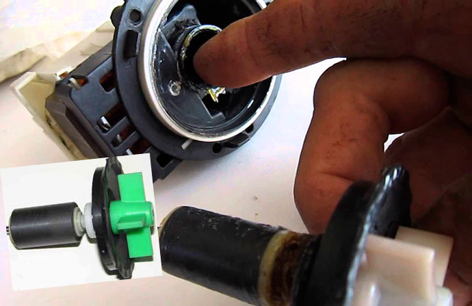 After this, clean all pump parts, remove any dirt, and inspect the bearing. Lubricate it. If it's broken, replace it. Begin reassembling the drain pump using the photo you took before disassembling it.