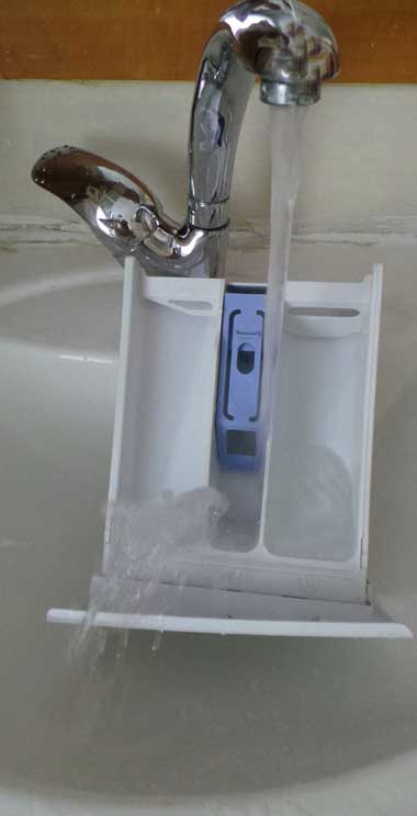- Is there a blockage in the dispenser channel, the function of which is to flush the powder into the tank? In such cases, water flows into the dispenser, but due to a clogged channel, it is unable to flush the required amount of detergent into the drum. To avoid such problems, periodically remove the detergent drawer and rinse it under lukewarm running water.