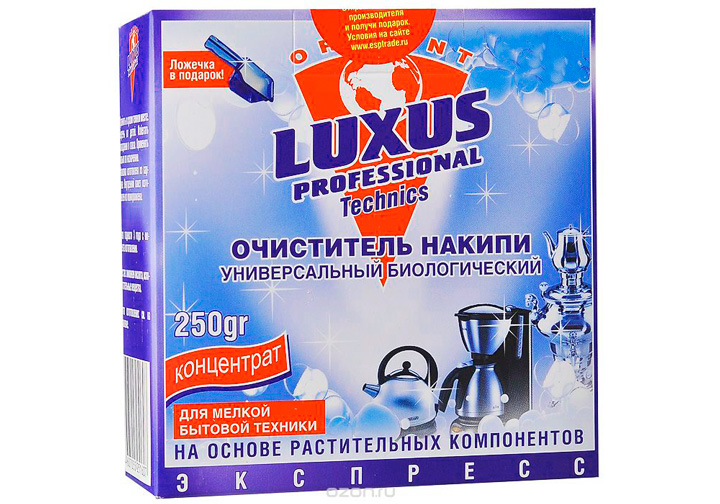 "Luxus Professional" is a specialized, universal descaling product from a domestic manufacturer. It can be used not only for descaling the heating element in washing machines but also for other electrically heated equipment.