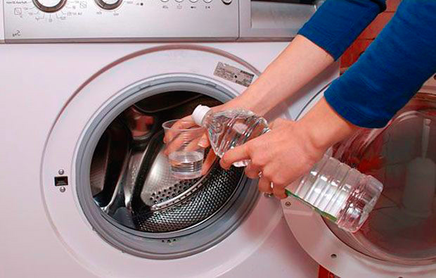 - Pour two cups of 9% vinegar into the washing machine drum.