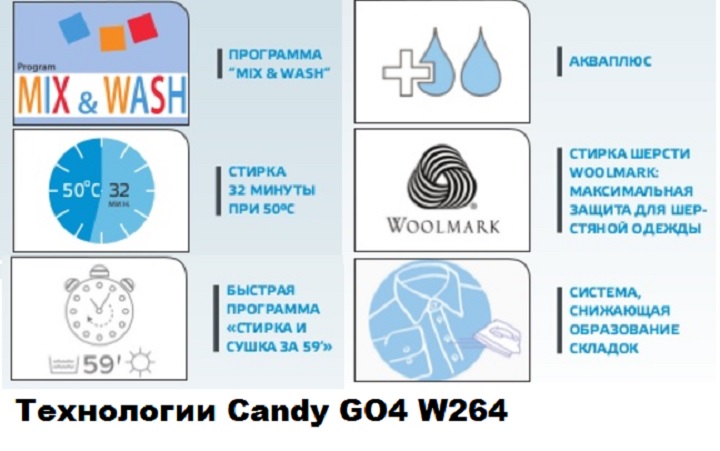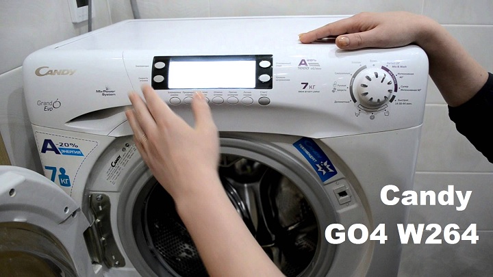 Candy GO4 W264 It's designed in an "outdoor" style. It's initially a bit garish, but you'll get used to it over time; some might even like it. This model is quite inexpensive compared to the previous models reviewed above. However, the price won't significantly affect the machine's capabilities; it will still provide high-quality washing and drying.