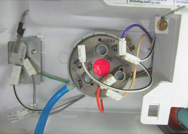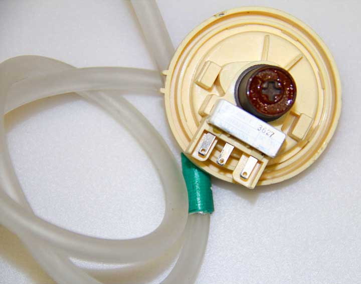 - The pressure switch in the washing machine is attached to the side panel and held in place with screws. Disconnect the wires and the hose leading to the fitting from the part. The hose is attached with a clamp that can be extended or unscrewed.