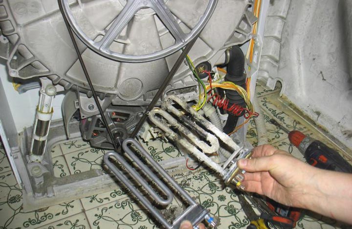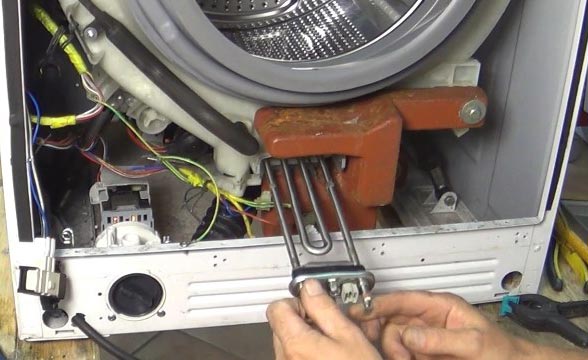 - Kui kütteelement on vigane, tuleb see eemaldada. Selleks keerake lahti juhtmete vaheline polt ja tõmmake element masinast välja. Kütteelement võib olla kinni kiilunud, mistõttu on seda ilma kummist haamrita raske eemaldada.