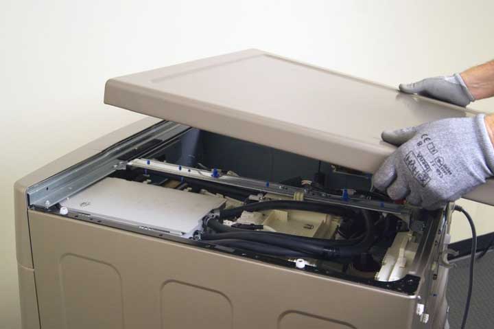 Pealtlaetavad pesumasinad tuleb küljelt lahti võtta. Põhimõte on täpselt sama, välja arvatud see, et küttekeha kattev kate asub ühel küljel.