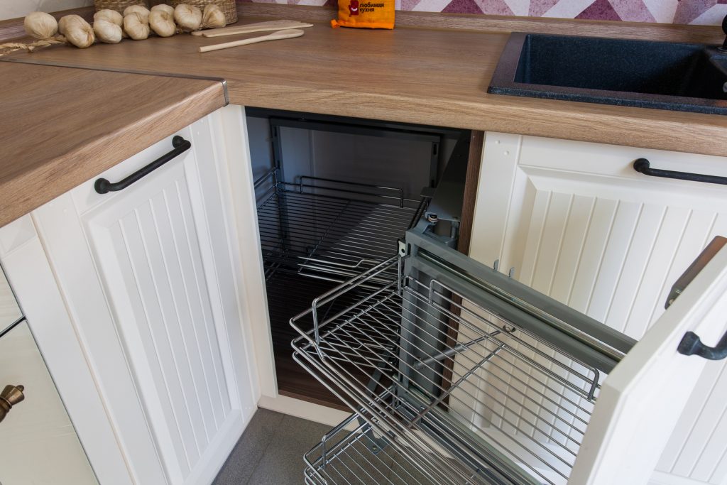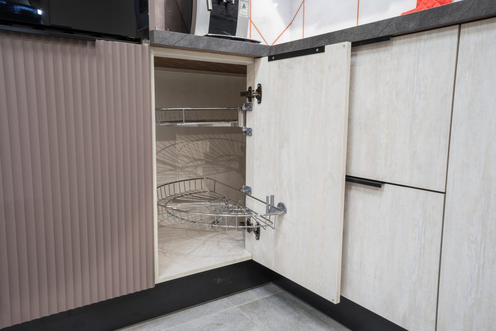 - Отворени рафтове и метални решетки на кухненските шкафове.