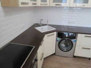 - Инсталирането на пералня в кухнята създава допълнителна работна повърхност с пълен размер. Това е от съществено значение в малка кухня. Много хора интегрират пералнята в предната част на шкафа. По този начин тя се слива с дизайна и изглежда спретнато и подредено. Ако това не е възможно, е достатъчно да се монтира плот, който съответства на цвета на шкафа. Това е по-евтин, но не по-малко популярен вариант.
