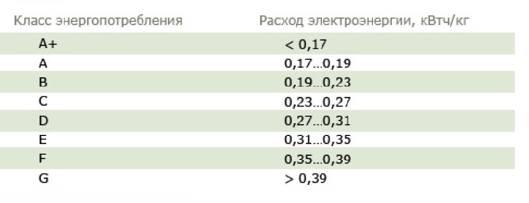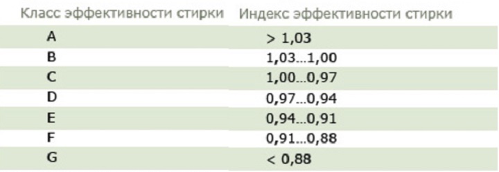 - Ефективност на пране и класът на този индикатор се присвоява на машината въз основа на резултатите от прането в тестов режим при температура от 60 градуса: клас А ще бъде зададен, ако резултатът е 100% по скалата за чистота на прането.