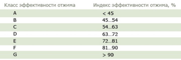 - Клас по спининг определя се от средното съдържание на влага в изпраните дрехи: за A е 45%, за B е 50%, а за C е 60%.
