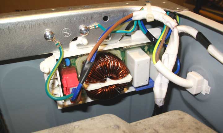 Първо, трябва да свалите горния панел на неработещата пералня LG и да намерите филтъра. На входа на филтъра има три проводника: първият е заземяващ, другите са неутрален и фазни (фаза/нула), а изходът е само неутрален и фазов.