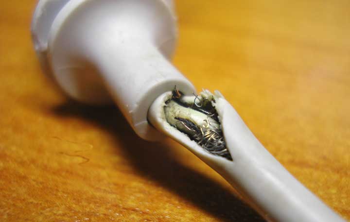 - Ако сте открили място, където проводникът е скъсан, можете да опитате да го поправите сами с помощта на електрическа лента или поялник. Не препоръчваме обаче да предприемате подобни действия, тъй като това не е в съответствие с правилата за безопасност и само ще влоши състоянието на кабела.