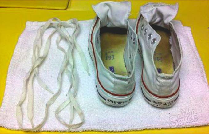 извадете стелките и връзките от обувките, накиснете ги в леген, след като ги натъркате със сапун за пране;