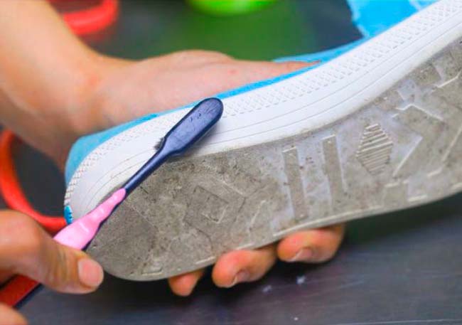 Не забравяйте за почистване на подметки на маратонкиС течение на времето тя също посивява. Най-лесният и бърз начин е да потъркате подметката с прах за зъби или избелваща паста за зъби. С помощта на твърда стара четка за зъби потъркайте подметката с малко количество прах.