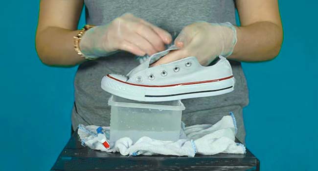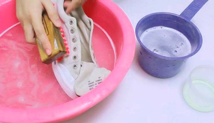 - Сега накиснете самите маратонки, добавете малко почистващ прах към обувките;