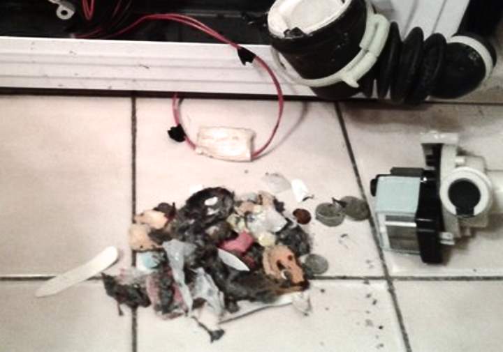 Първият тип възниква, когато малки части, като копчета, закопчалки и монети, се закачат и отскачат от дрехите по време на пране. Те се забиват в маркуча и блокират оттичането на водата, което води до неизправност на цялата система.